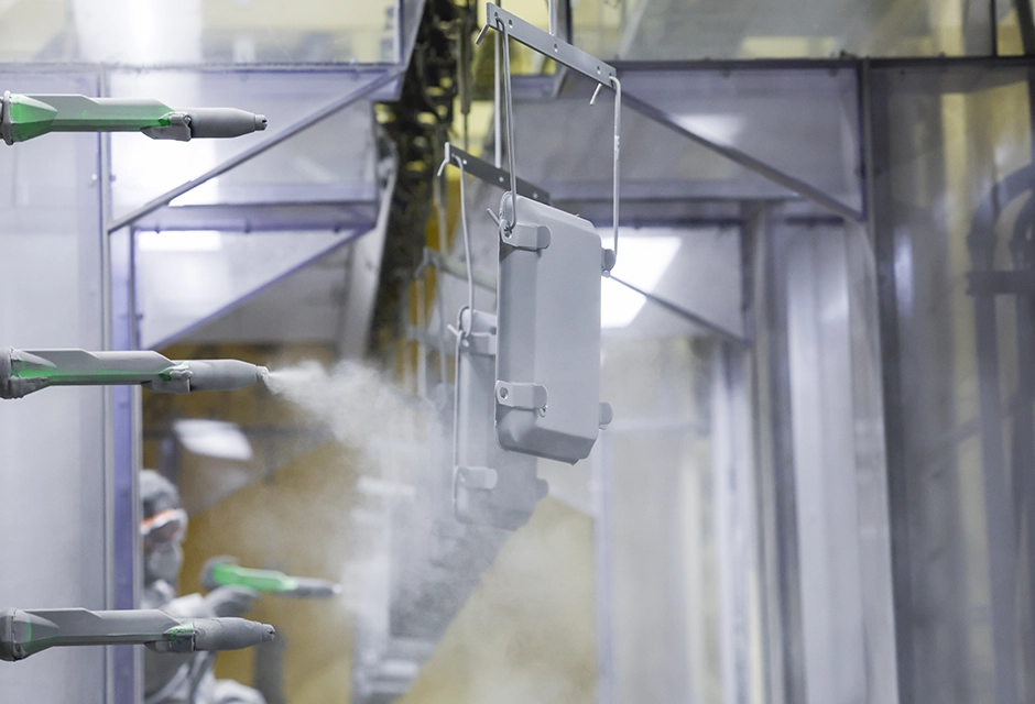 被塗物は自動前処理装置で処理が成された後、自動移載装置によって塗装セクションに供給されます。塗装工場内のコンベアは総延長650mあり、粉体塗装ライン及び溶剤塗装ラインでは被塗物を毎分1.35mのスピードで運んでいきます。
